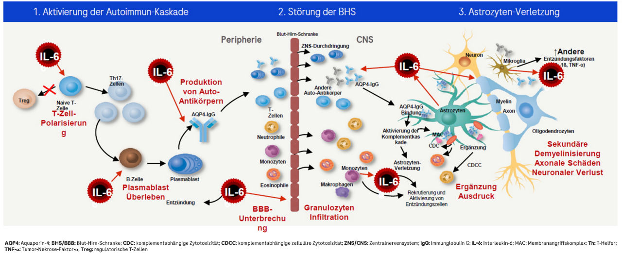 Abb. 1: IL-6 gilt als zentraler Vermittler bei der Entstehung von NMOSD1,12-22