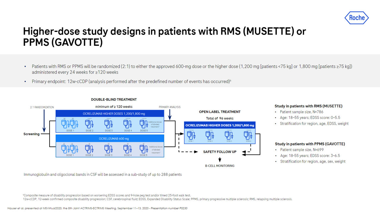 Die Phase-III-Studien GAVOTTE bei PPMS (NCT04548999) und MUSETTE bei RMS (NCT04544436) untersuchen deshalb, ob unter höherer Dosierung von Ocrelizumab eine verstärkte Progressionsverzögerung erreicht werden kann. Konsequenterweise ist hier auch in der RMS-Studie die Progressionsverzögerung gemessen anhand des EDSS und nicht die Schubreduktion primärer Endpunkt.8