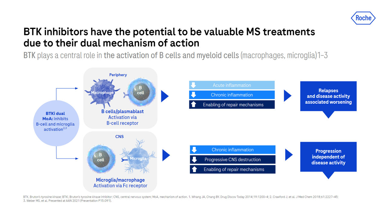 Mit Fenebrutinib entwickelt Roche eine Substanz in dieser Klasse, die sich durch eine sehr hohe Spezifität auszeichnet.13 Ein Alleinstellungsmerkmal ist, dass Fenebrutinib auch zur Therapie von PPMS gegen einen aktiven Komparator (Ocrelizumab) untersucht wird (FENtrepid, NCT04544449).14