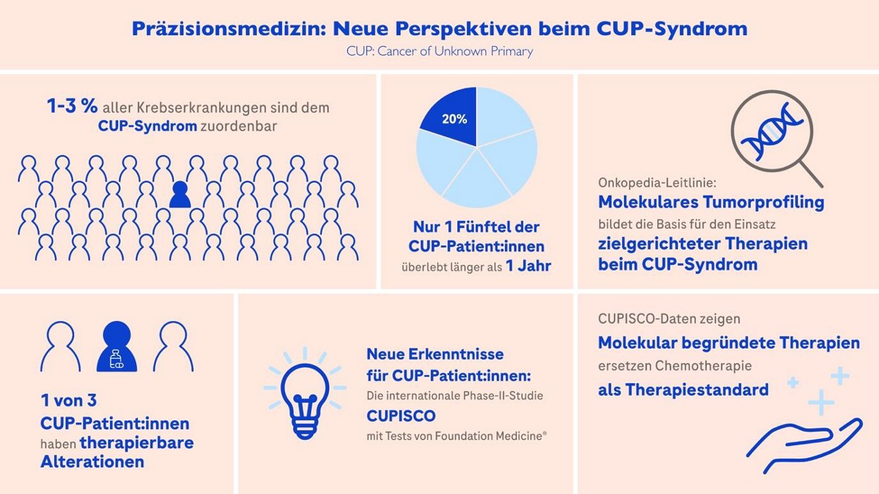 Die Diagnose CUP-Syndrom bedeutet für die Betroffenen in der Regel eine äußerst schlechte Prognose mit einer Lebenserwartung von im Schnitt nur einigen Monaten. Einen echten Fortschritt für die Behandlung dieser schwer zu therapierenden Krebserkrankung mit unbekanntem Primärtumor stellen die beim ESMO veröffentlichten Daten der CUPISCO-Studie dar. Im Rahmen dieses bahnbrechenden Studienkonzeptes wurde den Patient:innen der Zugang zu einer zielgerichteten Behandlung auf Basis einer individuellen Tumordiagnostik mit Tests von Foundation Medicine® ermöglicht. Das Ergebnis – ein verlängertes progressionsfreies Überleben.