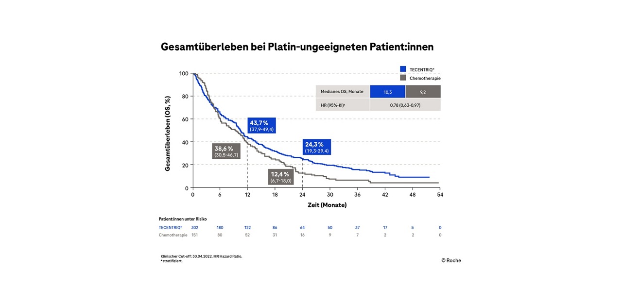 Etwa 30 % der NSCLC-Patienten kommen aufgrund des Zusammenspiels von hohem Alter, schlechtem Allgemeinzustand und/oder Komorbiditäten nicht für eine platinhaltige Therapie in Frage.2 Unter Tecentriq® (Atezolizumab) verdoppelte sich die 2-Jahres-Überlebensrate von Patienten mit fortgeschrittenem NSCLC im Vergleich zur Mono-Chemotherapie – bei deutlich geringeren Nebenwirkungen.1