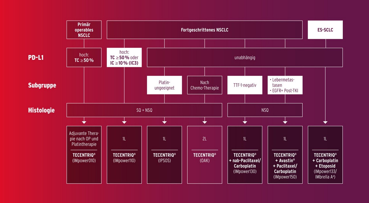 Nach mehr als zwei Jahrzehnten erbrachte der Vorreiter Tecentriq in Kombination mit Carboplatin und Etoposid eine signifikante Verbesserung des Gesamtüberlebens und des (intrakraniellen) progressionsfreien Überlebens bei ES-SCLC-Patienten – bei guter Verträglichkeit, verbesserter Lebensqualität.3-6 Explorative 6-Jahresdaten der Verlängerungsstudie IMbrella Aa und Real-World-Daten unterstreichen die Bedeutung der Chemo-Immuntherapie mit Atezolizumab.7,8