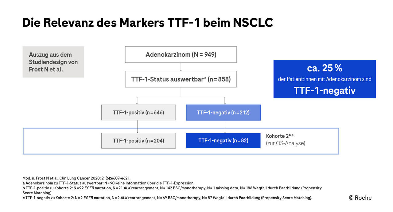 Grundlage für die Empfehlung ist die retrospektive Studie von PD Dr. Frost und Kolleg:innen. Die Daten sind eindrücklich und zeigen, dass ein Pemetrexed-freies Regime für Patient:innen mit TTF-1-negativen Adenokarzinomen das Risiko zu versterben um 60 % senkte (HR: 0,40).1